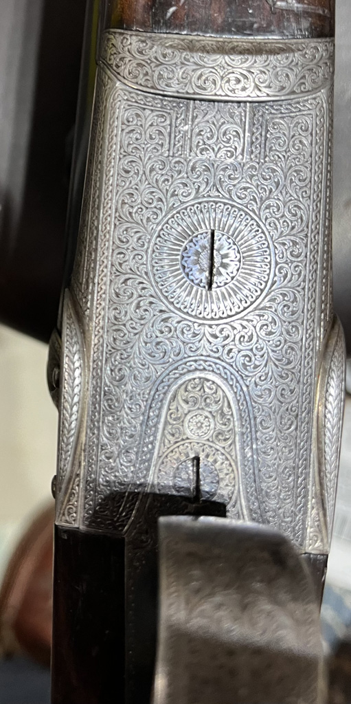 This is from a 1904 H&H Royal Deluxe. Very unusual and atypical engraving on the locks and belly.
